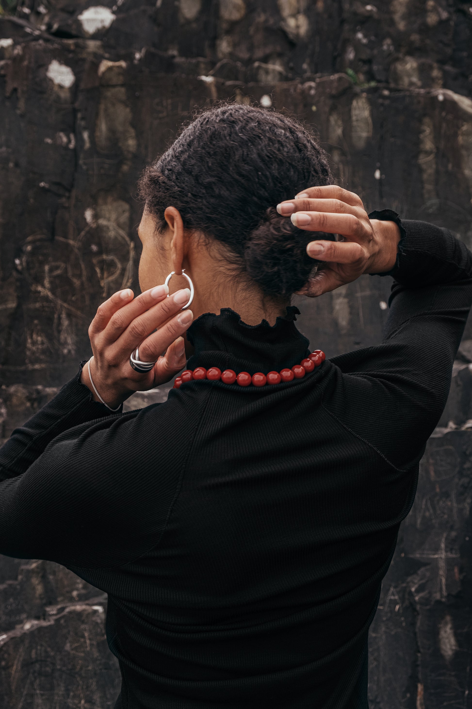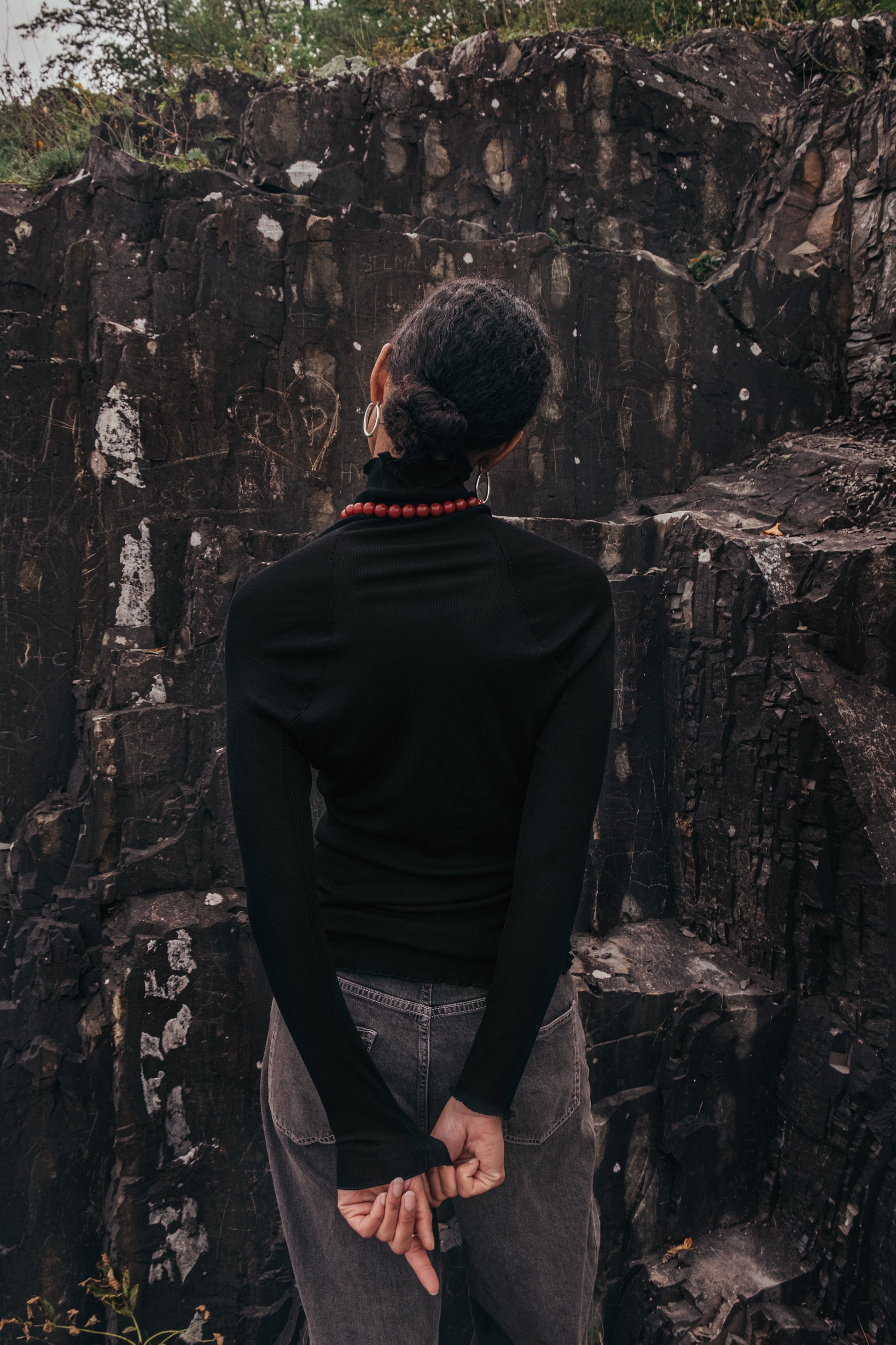The turtleneck features our beloved raglan sleeves—meaning their seams follow the collarbones (front) and shoulder blades (back), drawing subtle lines that also serve as a decorative element. This flatlock seam accentuates the sleeves. This sleeve seam construction makes the arms appear slimmer.