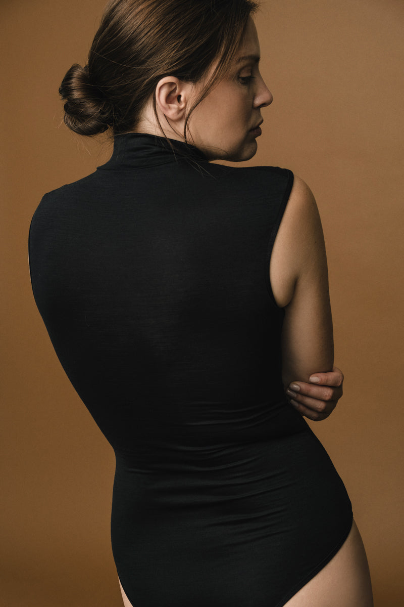 To minimalistyczne body sprawdzi się zarówno w roli zimowej bielizny, jak ubrania. Można je włożyć pod marynarkę lub rozpinany sweter. Będzie świetnie wyglądało z elegancką spódnicą, spodniami cygaretkami, jeansami i dresem. Możesz je schować pod oversize'owym golfem, traktując jak termoaktywną pierwszą warstwę.
