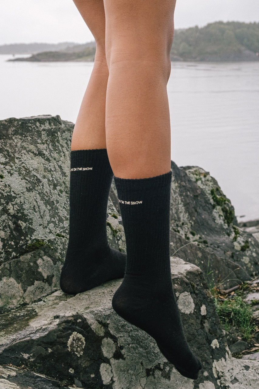 Skarpetki z wełny merino w czarnym kolorze z haftowanym kremowym logo LOVE ON THE SNOW. Kupicie je w uniwersalnym rozmiarze, który mieści się w zakresie 35-42. W składzie jest przewaga wełny merino z certyfikatem mulesing-free, niewielki dodatek poliamidu zapewnia lepszą elastyczność, a także odporność na przetarcia.