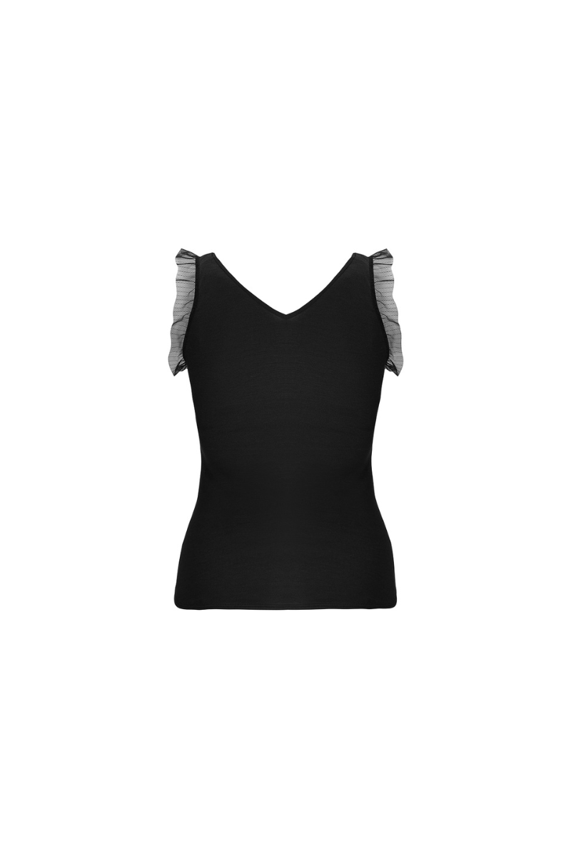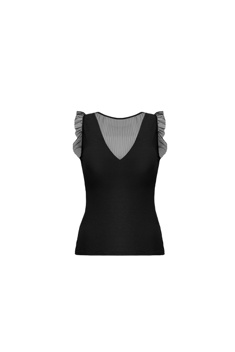 Elegancki top uszyty z wełny merino z tiulową wstawką w dekolcie i tiulowymi falbankami. Gładkie zabudowane plecy z niewielkim trójkątnym dekoltem. Można go nosić jako podkoszulkę w chłodniejsze dni lub jako bluzkę pod marynarkę albo rozpinany sweter.