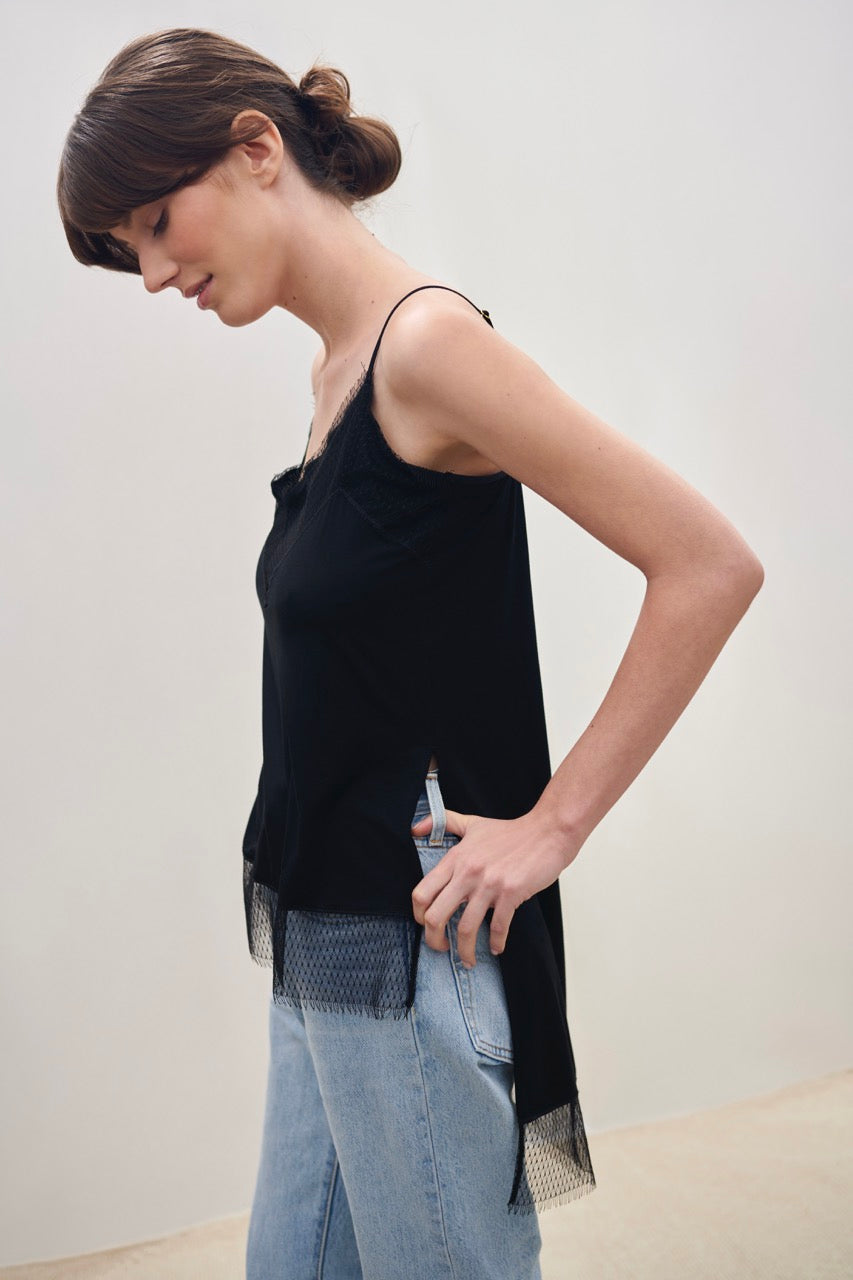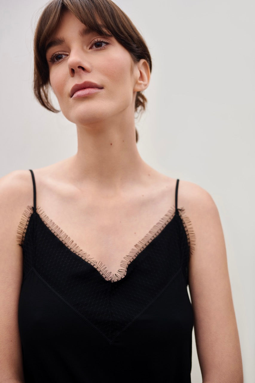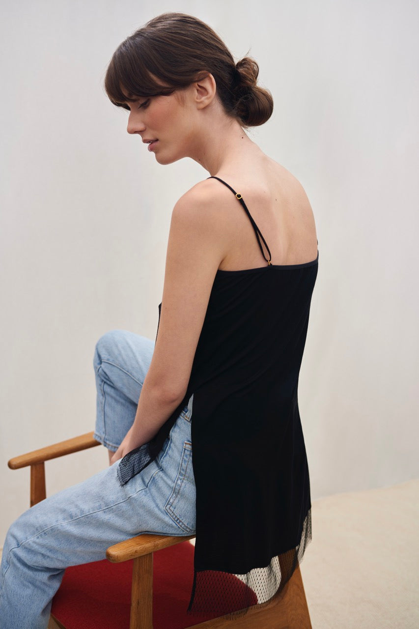 Wełniana bluzka na makaronikowych ramiączkach z dekoltem wykończonym koronką w geometryczny wzór. Top ma nietypowy - bo znacznie dłuższy od przodu tył oraz boczne rozcięcia, które pozwalają używać go w funkcji tuniki.