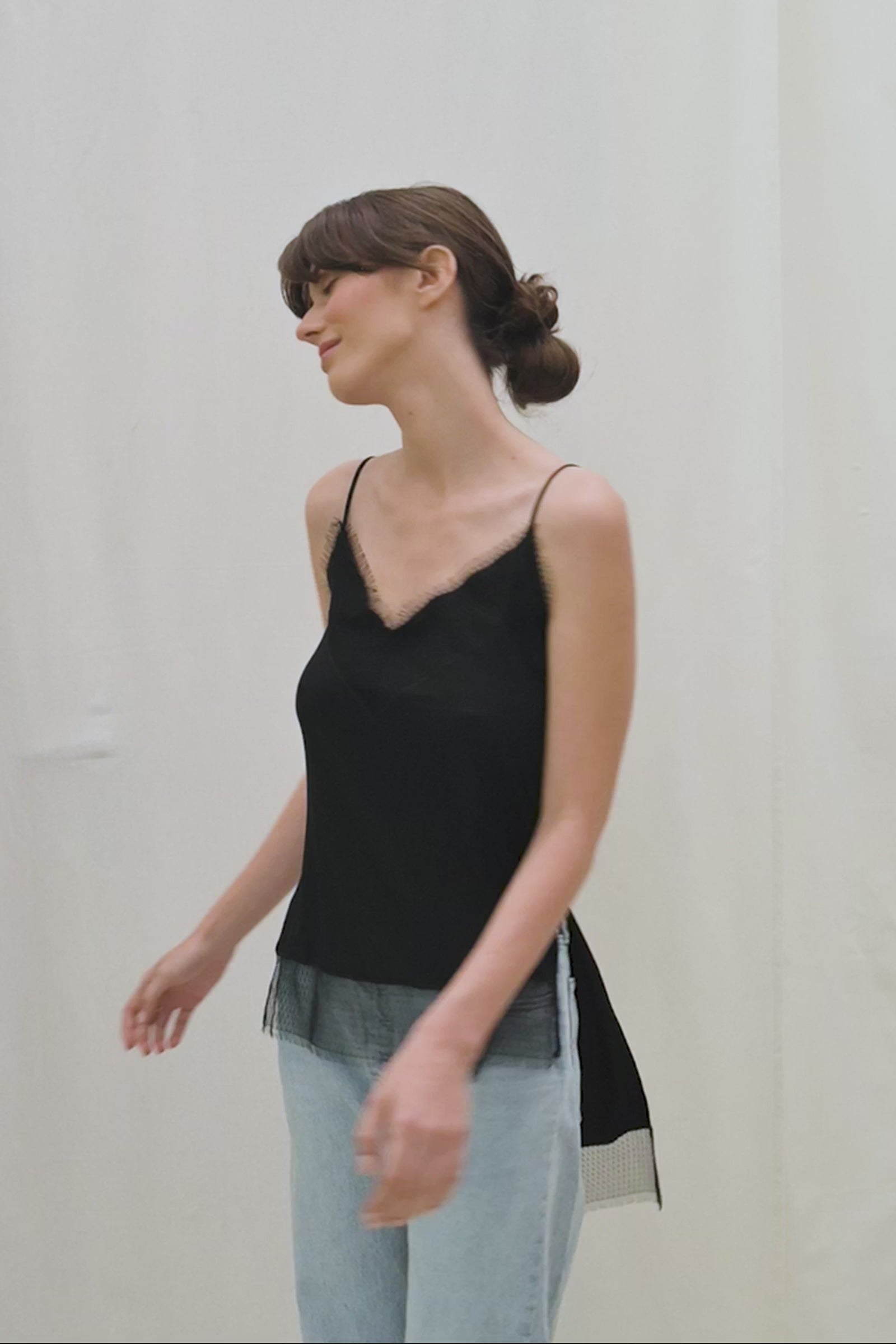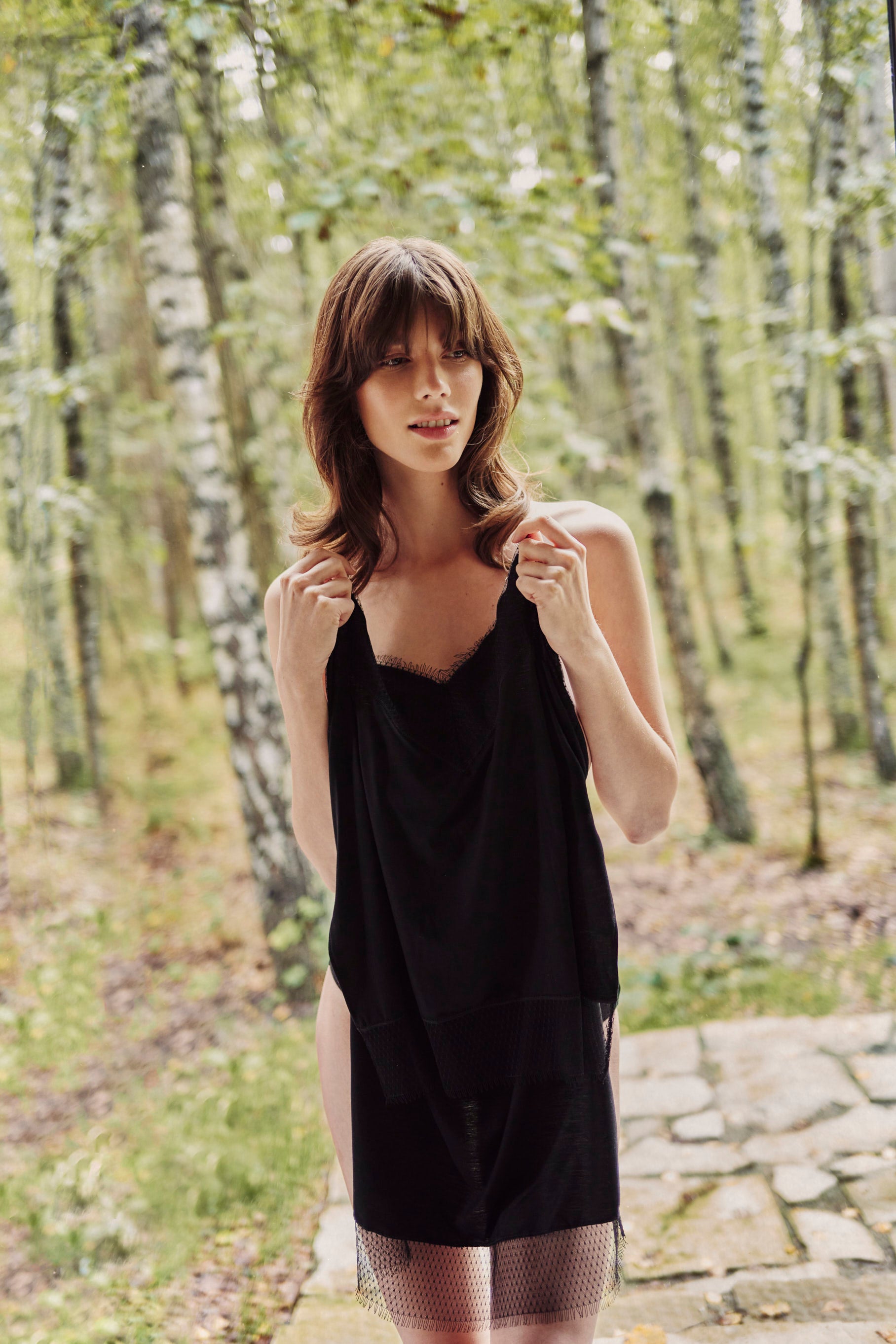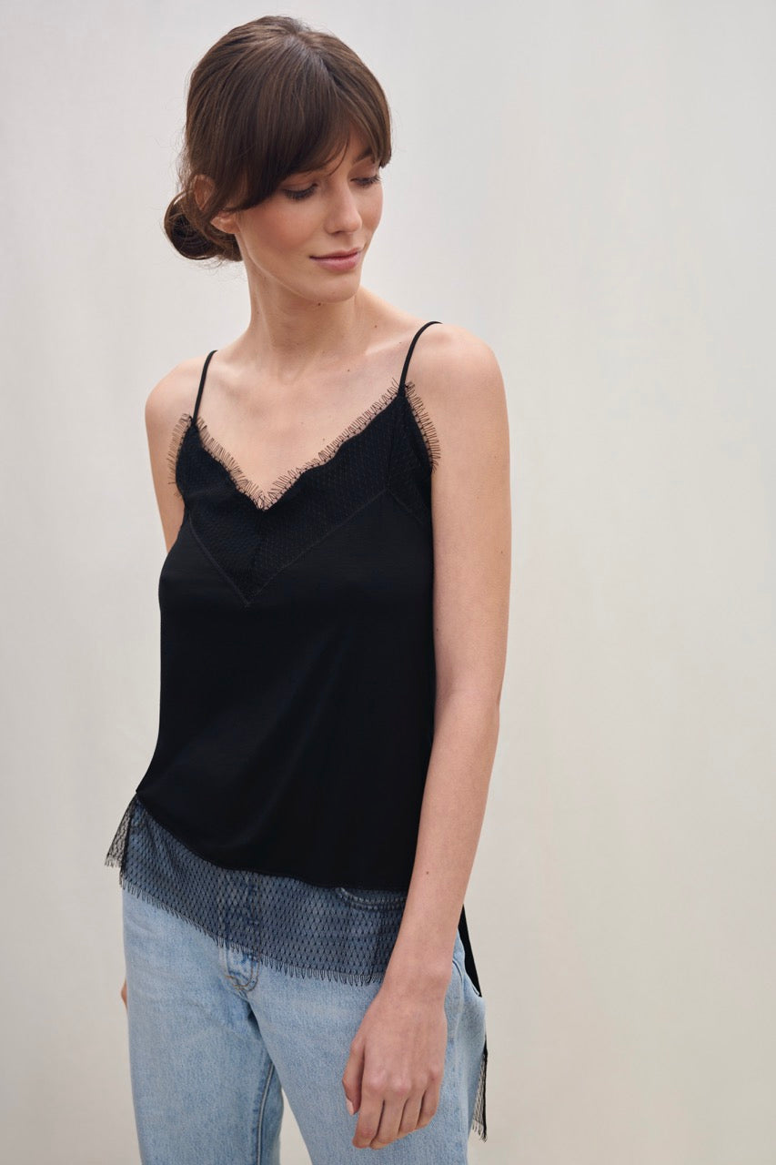 Wełniana bluzka na makaronikowych ramiączkach z dekoltem wykończonym koronką w geometryczny wzór. Top ma nietypowy - bo znacznie dłuższy od przodu tył oraz boczne rozcięcia, które pozwalają używać go w funkcji tuniki.