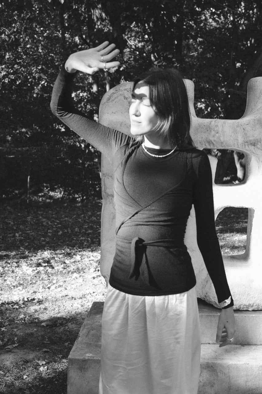 Wełniana wiązana narzutka uszyta z dzianiny merino wyprodukowanej w polskiej dziewiarni. W eleganckim czarnym kolorze. To trzeci element naszego "trio", który możesz nosić na wierzchu lub jako pierwszą warstwę. Widoczne na zdjęciu longsleeve i top bez rękawów są do kupienia osobno w naszych nowościach na jesień 2025.