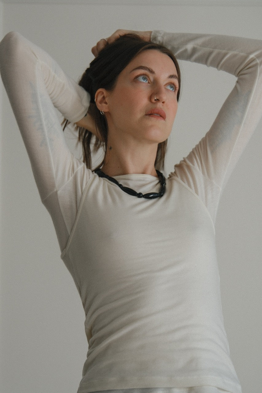 Wełniany top bez rękawków z lekko zaokrąglonym dekoltem uszyty z wyprodukowanej w Polsce dzianiny o składzie 97% merino, 3% EA. Super miękkiej, elastycznej i ciepłej. Zaprojektowałyśmy go jako dodatkową warstwę do noszenia na longsleeve Sødalen - (do kupienia jako osobny produkt) stanowią razem oryginalny zestaw. Ramiączka topu celowo mijają się z dekoltem bluzki, tworząc ciekawy efekt prześwitującego ciała.